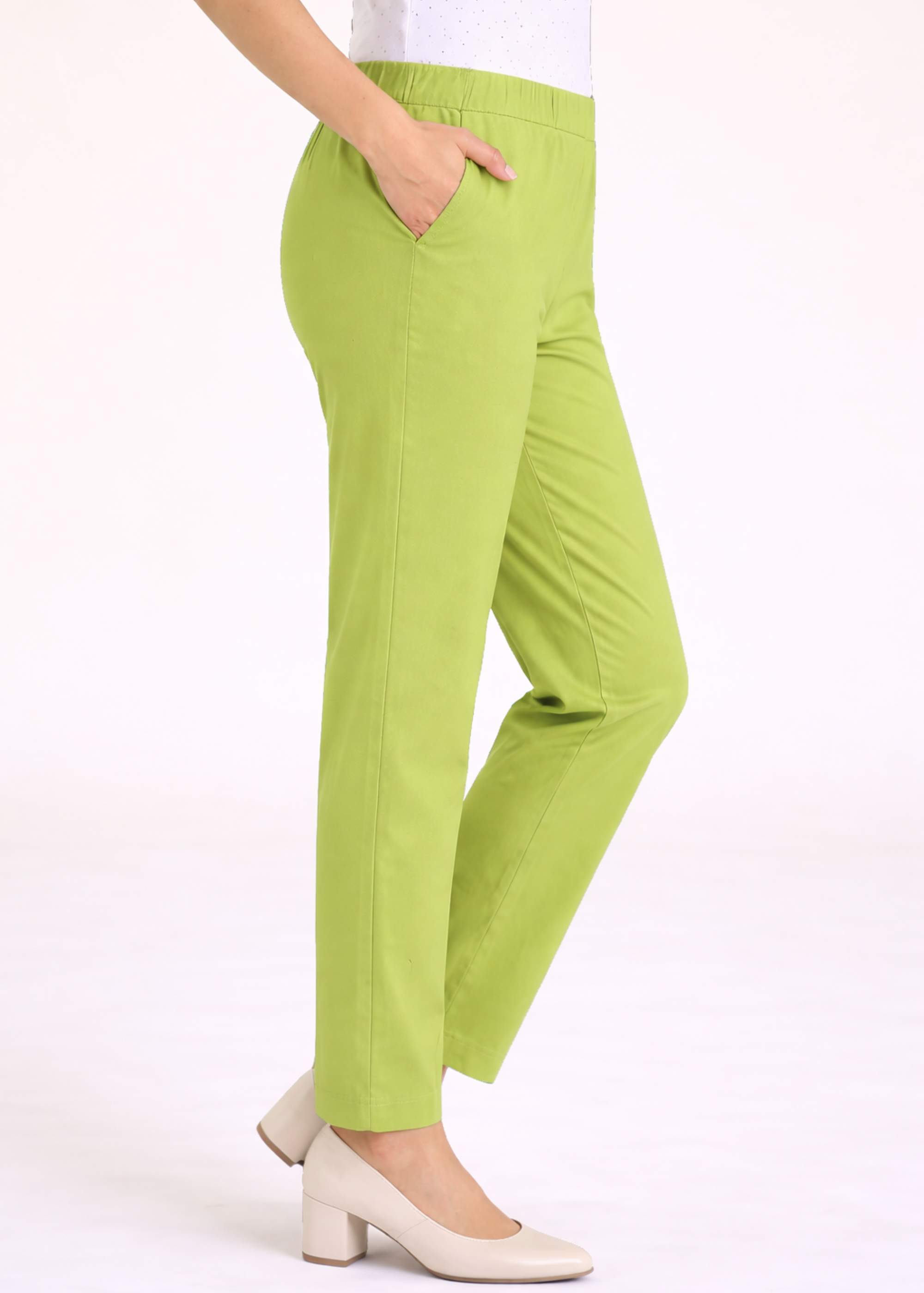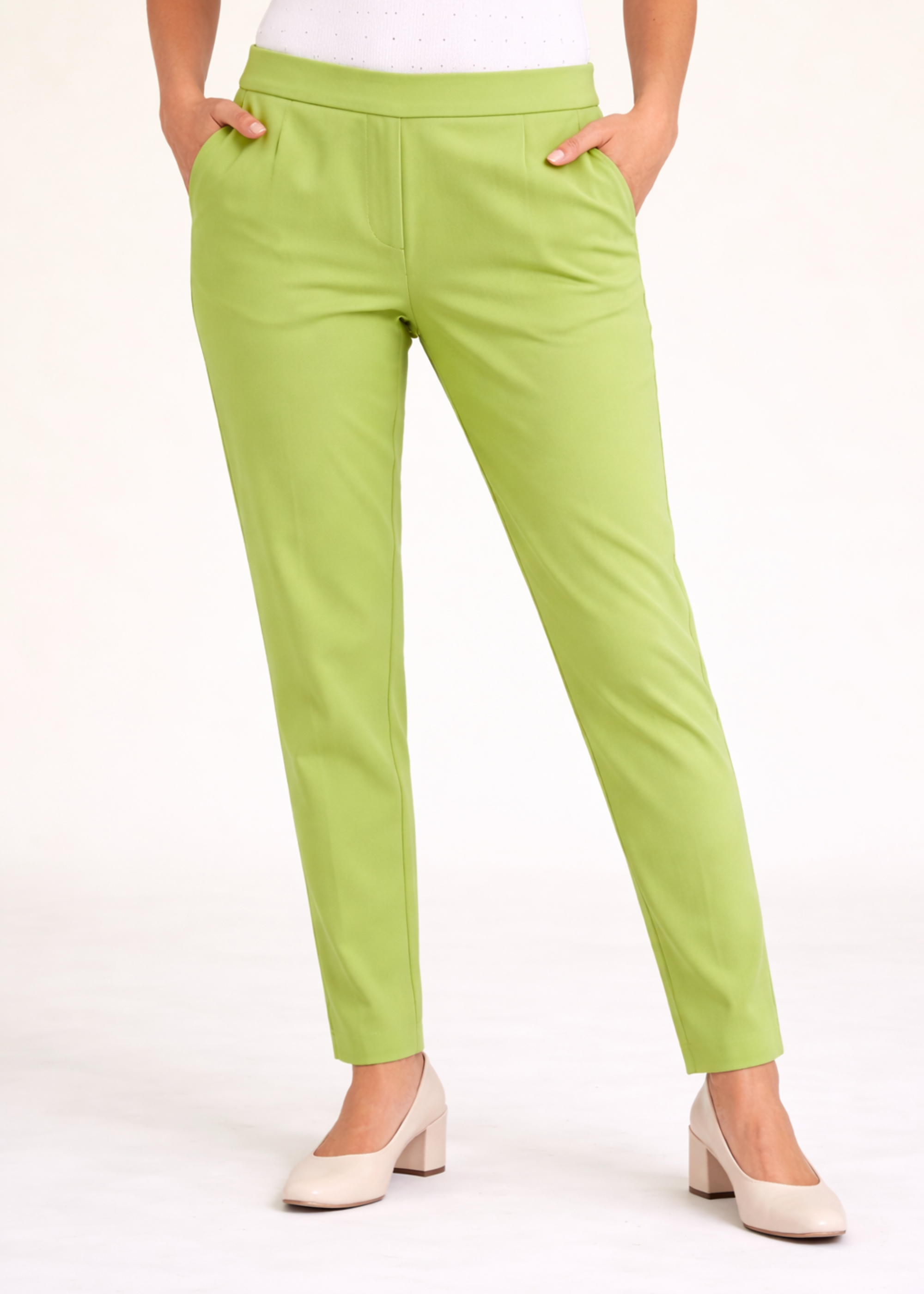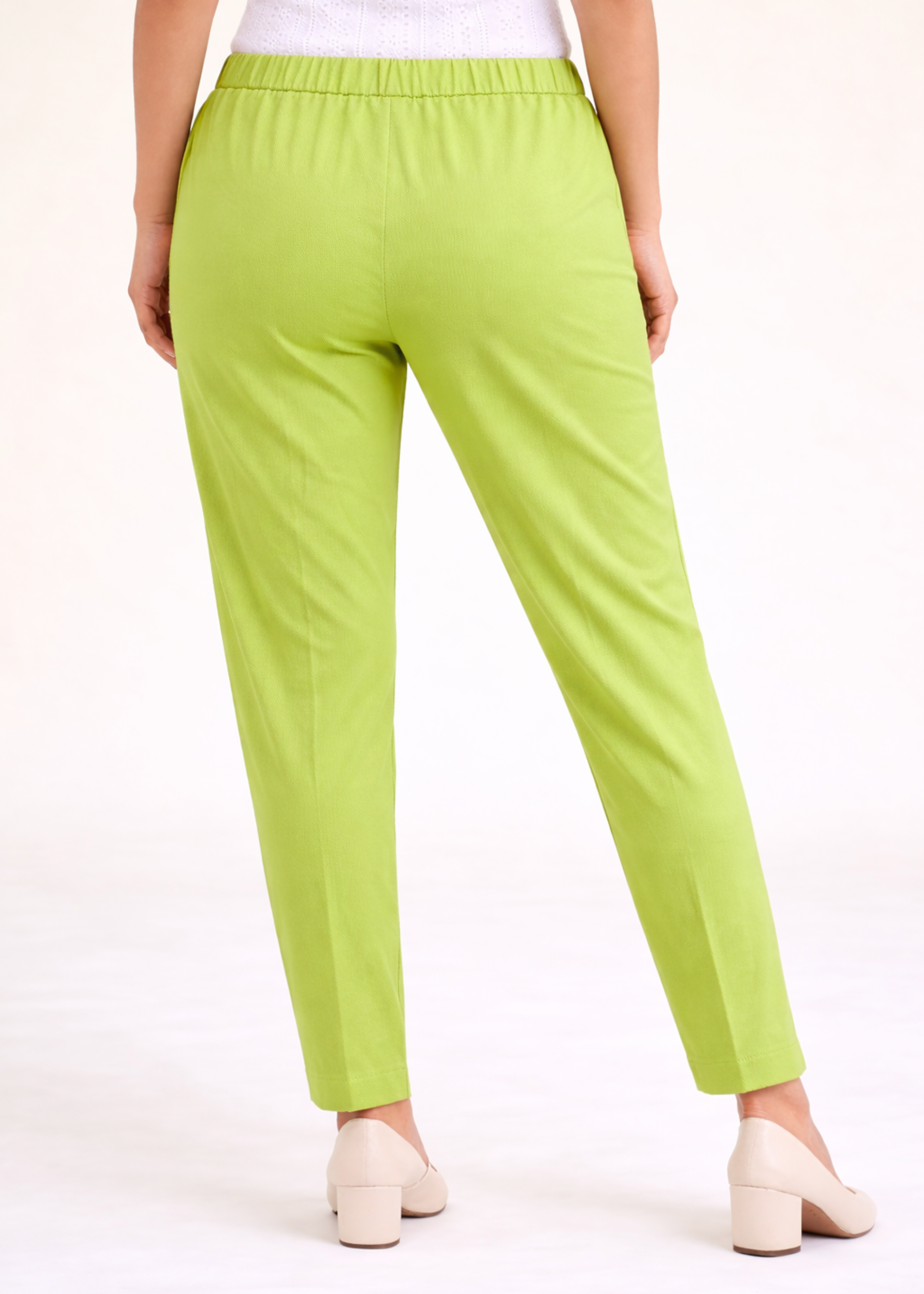 The smart tapered silhouette enhances your natural shape, while the mid-rise elasticated waistband provides a secure yet comfortable fit that moves with you throughout the day. Whether you're heading to the office, travelling, or stepping out for a casual outing, these versatile trousers keep your look effortlessly polished and confident.